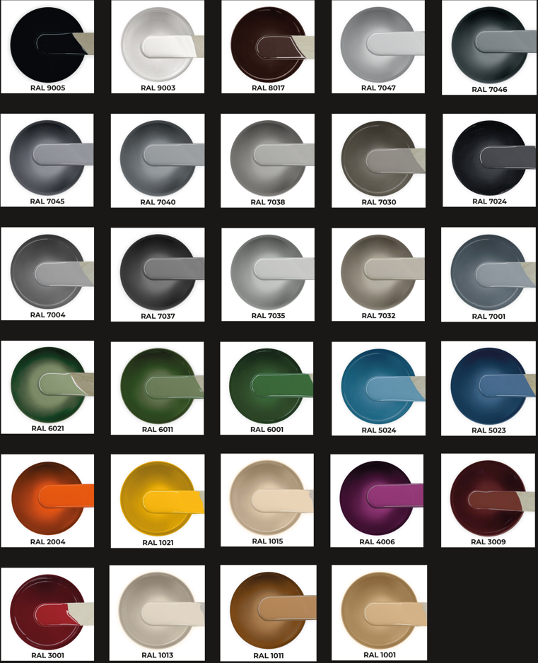 Każdy z systemów dostępny jest w wielu wariantach kolorystycznych i wykończeniowych. W razie potrzeby nasz zespół doradzi najlepsze rozwiązanie, dostosowane do warunków technicznych i oczekiwań estetycznych. Poniżej przedstawiamy przykładowe kolory, na zamówienie posiadamy wszystkie kolory z palety RAL.